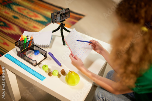 Cute little elementary schoolgirl studying online, looking video lesson on smartphone. Kids at-home activity, creativity and distant education