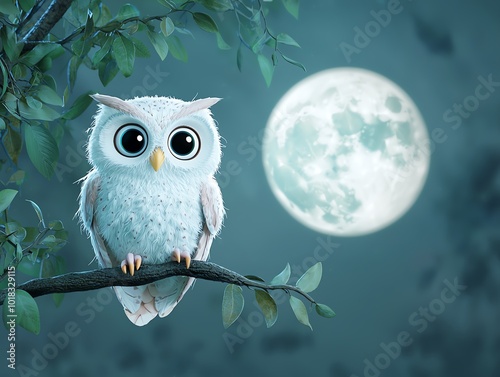 Cute owl sitting on a branch under a full moon, serene night landscape.