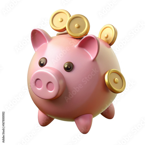 Cute pink piggy bank with golden coins inserted isolated on transparent background