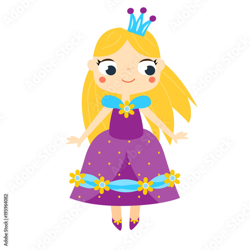 Cute princess in long violet dress and crown. Girl in queen costume. Cartoon style vector illustration