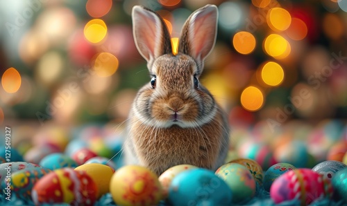 Cute rabbit among colorful Easter eggs in spring. Generative AI