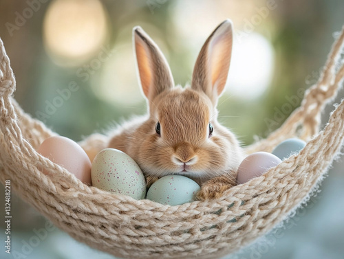 Cute rabbit resting with pastel eggs in a cozy setting