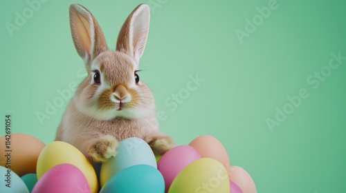 Cute rabbit sitting among colorful eggs in a bright green setting for a festive spring celebration