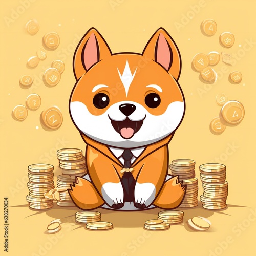 Cute Shiba Inu Dog in suit With Gold Coins Cartoon Illustration. Animal Business finance Concept . Flat Cartoon Style. Generative ai