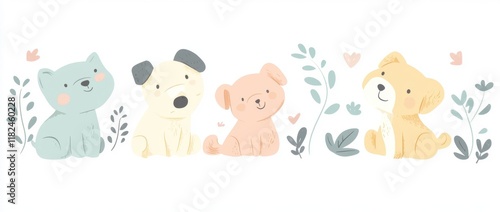 Cute, simple clipart of dogs in various poses and sizes, in pastel colors on a white background, with a minimalistic design featuring large shapes, suitable for nursery art Generative AI