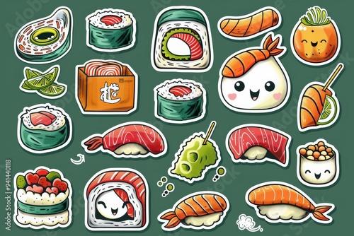 Cute sushi characters in a kawaii style, each with smiling faces, making for a fun and playful food-themed design.