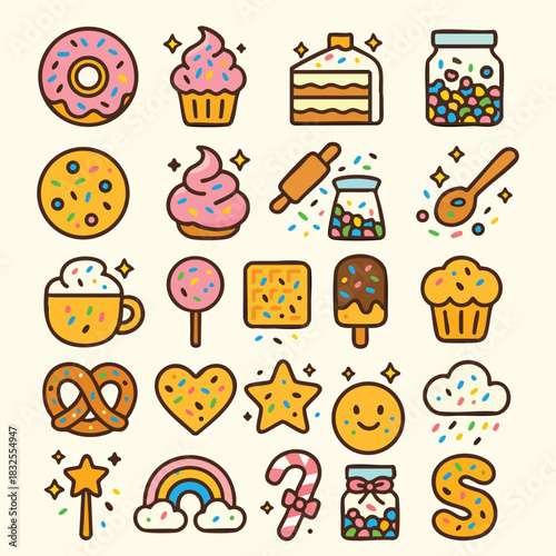 Cute sweets and dessert icon set with colorful sprinkles Kawaii cartoon vector illustrations of donut cake and candy for party decoration