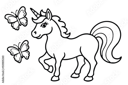 Cute Unicorn with Butterflies Coloring Page Illustration