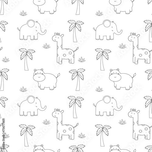 Cute vector linear drawing seamless pattern with safari animals, elephant, hippo, giraffe and tropical plants. African animals line art. Hand drawn, doodle, contour vector pattern.