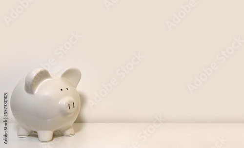 Cute white ceramic piggy bank on a white background to collect money coins in