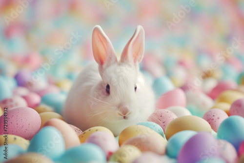 Cute white rabbit and colorful easter eggs. Happy easter day.