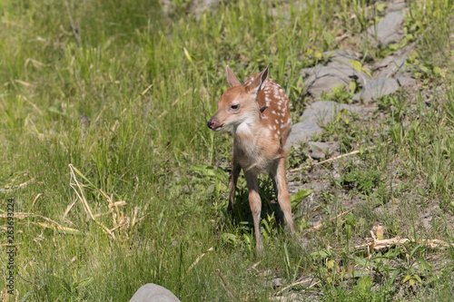 Cute White tailed deer fawn paling in meadow