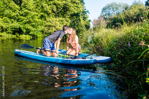 cute young couple paddle boarding on a river