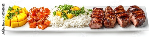 Cutout of set of 4 mango chutney, grilled meat, and rice with sauce splashes enhancing tropical and savory flavors, isolated on white background