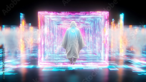 Cyberpunk 3D Render: Mysterious Figure Calmly Navigates Vibrant Neon Portal. AI Generated