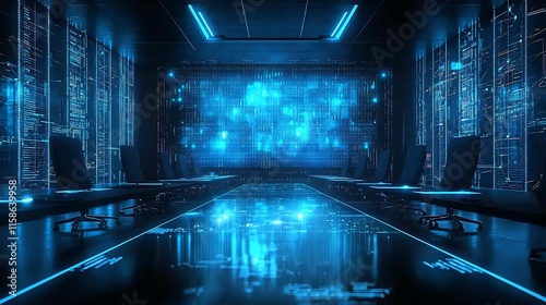 Cyberpunk Conference Room A futuristic conference room bathed in vibrant blue neon light, featuring holographic displays and sleek, dark furniture