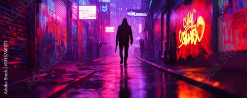 Cyberpunk gang wars, futuristic weapons, graffiti-covered walls, rain-soaked streets