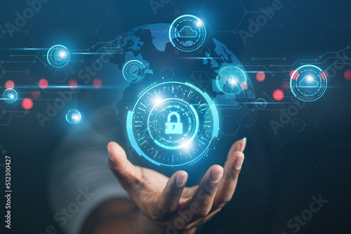 cybersecurity concept Business man shows how to protect cyber technology network from attack by hackers on the internet. Secure access to privacy through smartphones Meta protection.