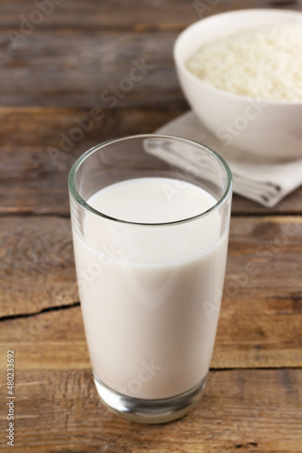 Dairy free rice milk in glasses and rice grains in a bowl on wooden background