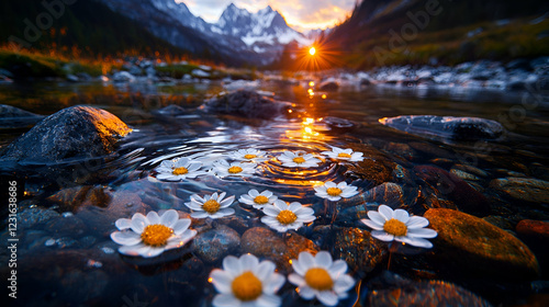 Daisies float on mountain stream at sunset