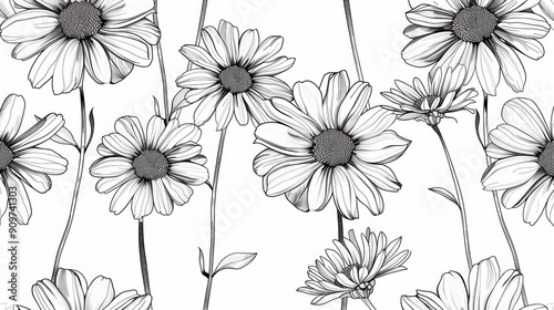 Daisy pattern, hand draw, simple line, black and white. copy space.