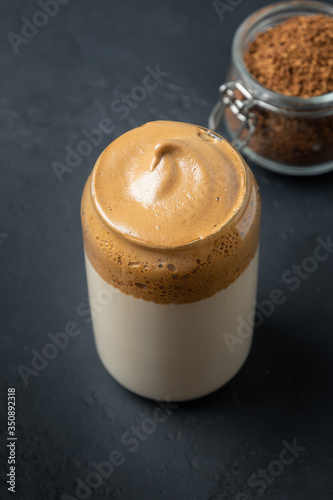 Dalgona coffee on black. Trendy korean drink with foam of instant coffee. Vertical shot.