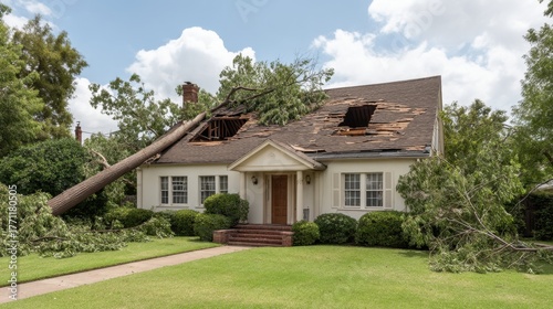 Damaged House with Fallen Tree on Roof After Severe Storm, Depicting Impact of Natural Disaster on Residential Property