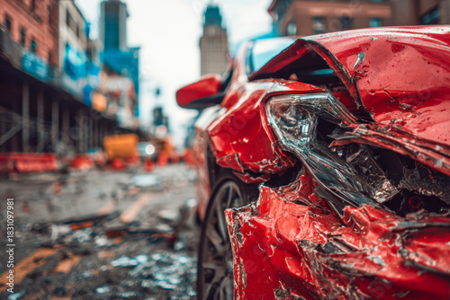 Damaged red sports car with crushed front hood and broken headlights on an urban street filled with debris and blurred cityscape in the background