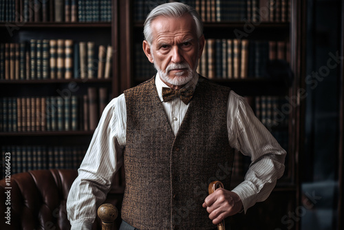 Dapper older man wearing a tweed vest and bowtie, holding a cane while standing in a luxurious library.