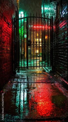 Dark Alleyway with Glowing Reflections in Rainy Night Scene