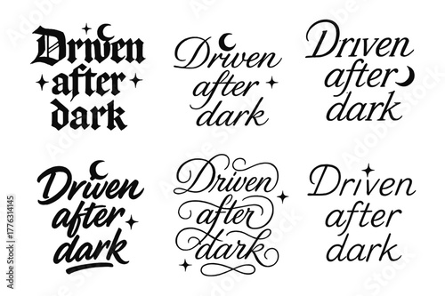 Dark Calligraphy Styles. Driven after dark. Create a calligraphy lettering illustration of the phrase: Driven