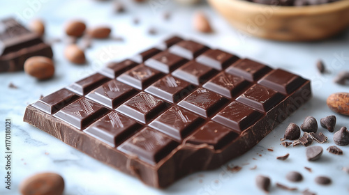 Dark chocolate bar with scattered chocolate chips and almonds.