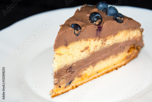 Dark chocolate blueberry cream cake on plate