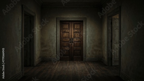 Dark corridor with closed wooden doors and dim lighting. Vintage interior design and mysterious ambiance.