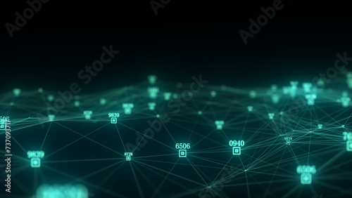 Dark cyberspace in digital background. Abstract technology wave with motion glowing dots and lines. Connection big data. Futuristic wireframe texture. Analysis a network connection. 3D rendering.