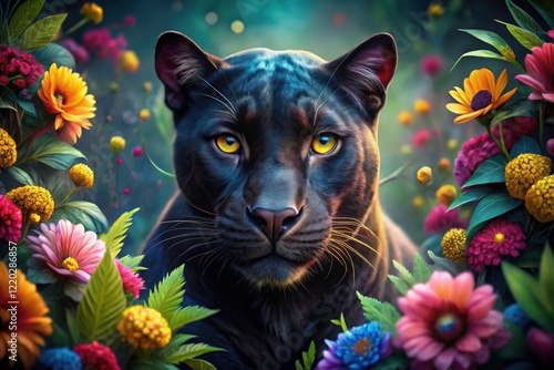 Dark fantasy botanical illustration: a tilt-shift miniature Black Panther, Art Nouveau style, floral portrait.
