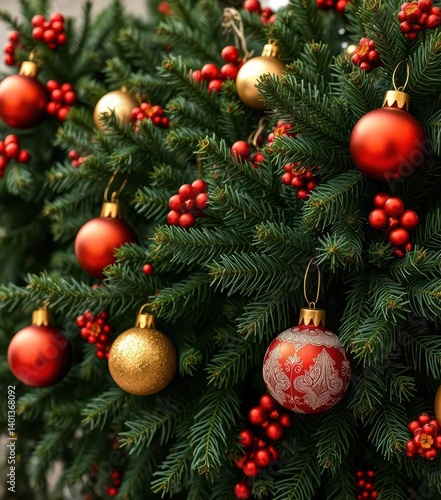 Dark green evergreen boughs adorned with gold, red, & white holiday ornaments, christmas, vintage, holiday