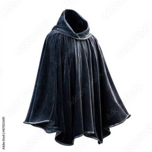 Dark Grey Velvet Hooded Cloak Isolated on White Background Fashion Accessory Costume Clothing Item
