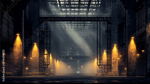 Dark, gritty industrial interior with light beams.