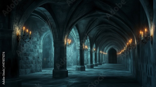 Dark, mysterious gothic hallway with stone columns, arches, and candlelight.