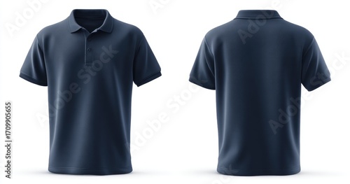 Dark navy polo shirt, front and back views, 3D mockup