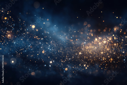 Dark Navy-Blue Abstract Background with Scattered Glittering Golden Stars or Bokeh Lights Falling from Above