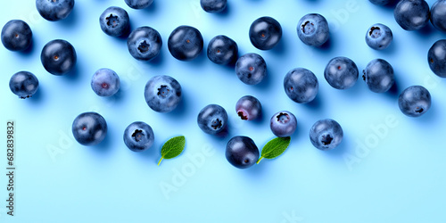 Dark purple fresh blueberry fruit On a blue background, there is space and a beautiful perspective.
