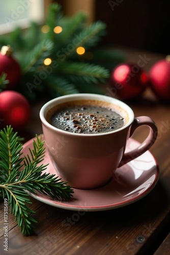 dark roast coffee in a cup with Christmas ornaments and mistletoe around it, , cozy ambiance, holiday decor