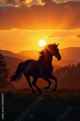 Dark silhouette of galloping horse against the golden sun setting behind rolling hills and trees, equine, horses, nature