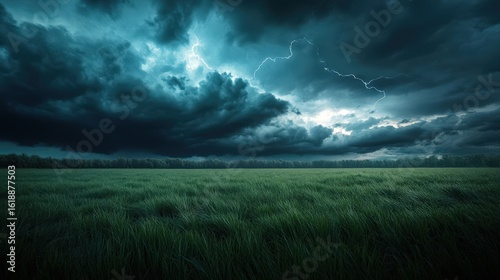 Dark storm clouds loom over a vast green field as lightning flickers in the distance, creating a dramatic and powerful atmosphere.