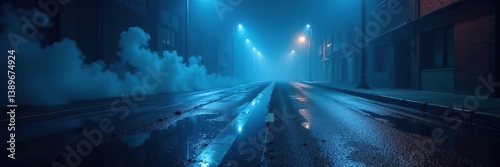Dark street with wet asphalt reflecting rays in water, abstract blue background with smoke and neon lights Empty scene with spotlights and concrete floor, abstract, water