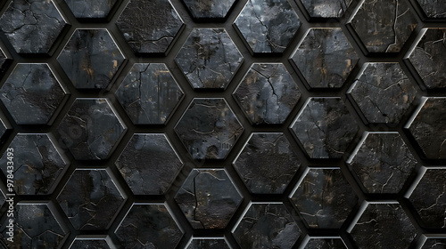 Dark, textured hexagonal tiles create a dramatic, industrial background.