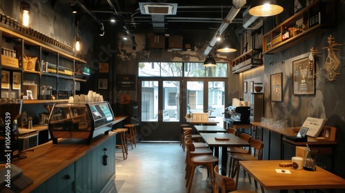Dark-themed loft cafe interior with an open layout, displaying various coffee choices and providing a cozy atmosphere for enjoying a coffee shop setting