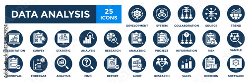 Data analysis icon collection set. Containing analysis,information, trend, forecast, decision,risk,research,report icon.